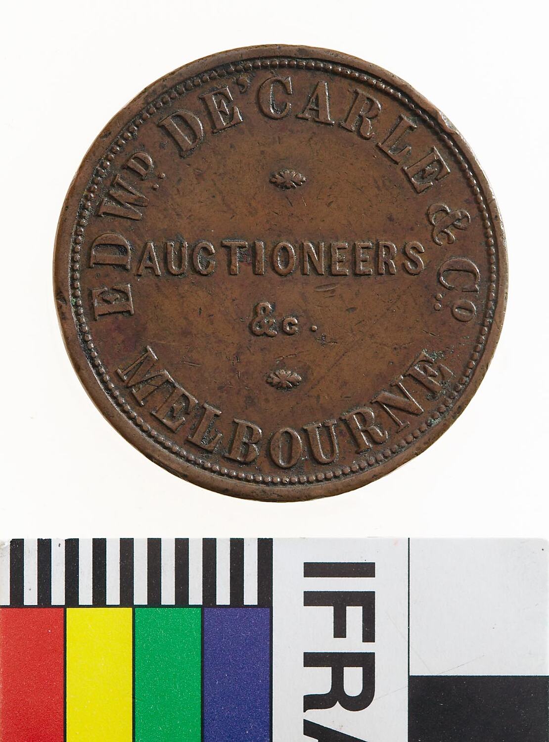 Within a border of 146 beads in four lines the first and last curved, EDWD. DE'CARLE & CO. / AUCTIONEERS / &c. / MELBOURNE