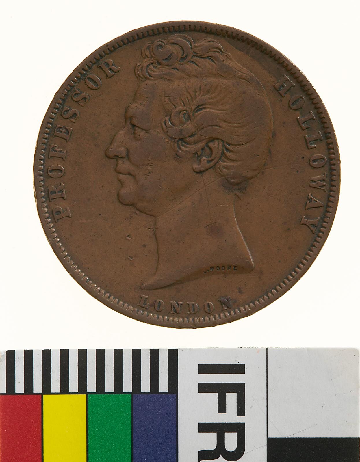 Obverse: PROFESSOR HOLLOWAY LONDON J. MOORE Reverse: HOLLOWAY'S PILLS AND OINTMENTS 1857
