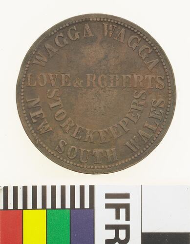 Copper One Penny Token, minted by Thomas Stokes, Melbourne. Issued by Love & Roberts, Storekeepers, Wagga Wagga, New South Wales, 1865. The earliest records of this business are two advertisements from 1866, the first for the Newtown Store Annual Stock-Taking. The second described their new stock for the 'Autumn and Winter season' and gave an extensive listing of the range of fabrics, hats and other draperies they sold. In 1867 they were listed as 'Storekeepers, Wagga Wagga' in Samson's National Directory of New South Wales for 1867.