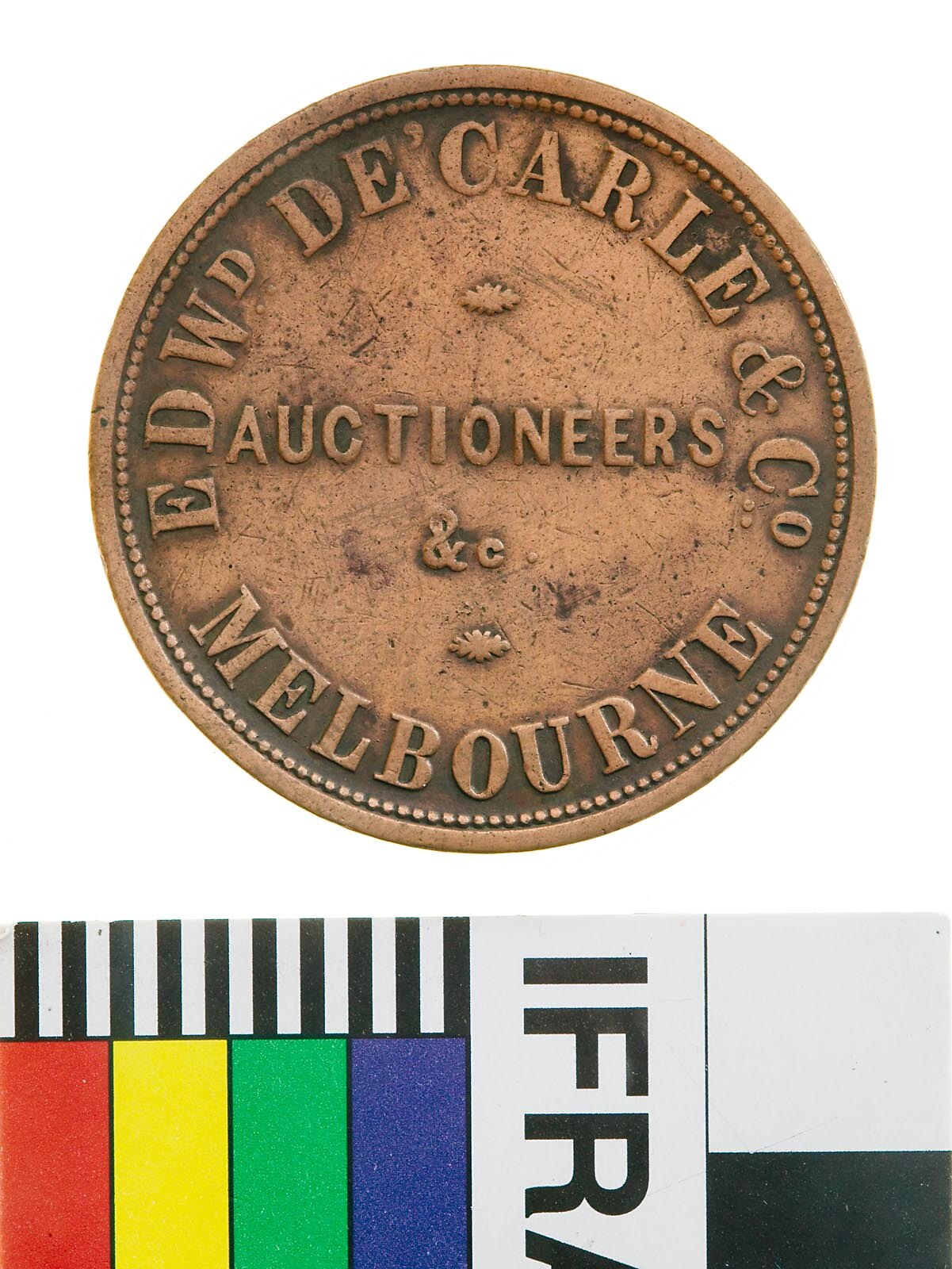 Within a border of 146 beads in four lines the first and last curved, EDWD. DE'CARLE & CO. / AUCTIONEERS / &c. / MELBOURNE