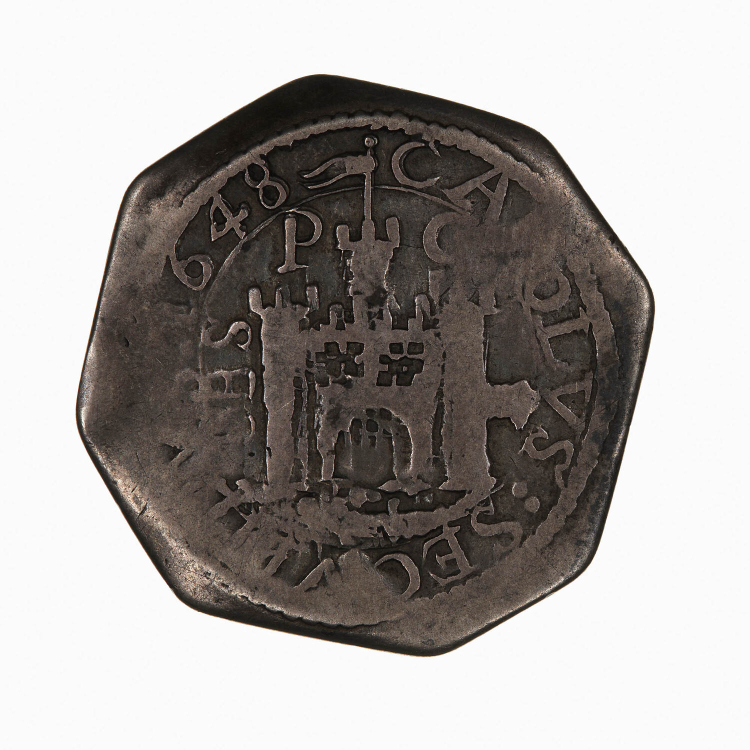 Castle from right turret of which a cannon protrudes; at left, OBS; above divided by centre turret, PC; around, CAROLVS SECVNDVS 1648 (the N of SECVNDVS retrograde)