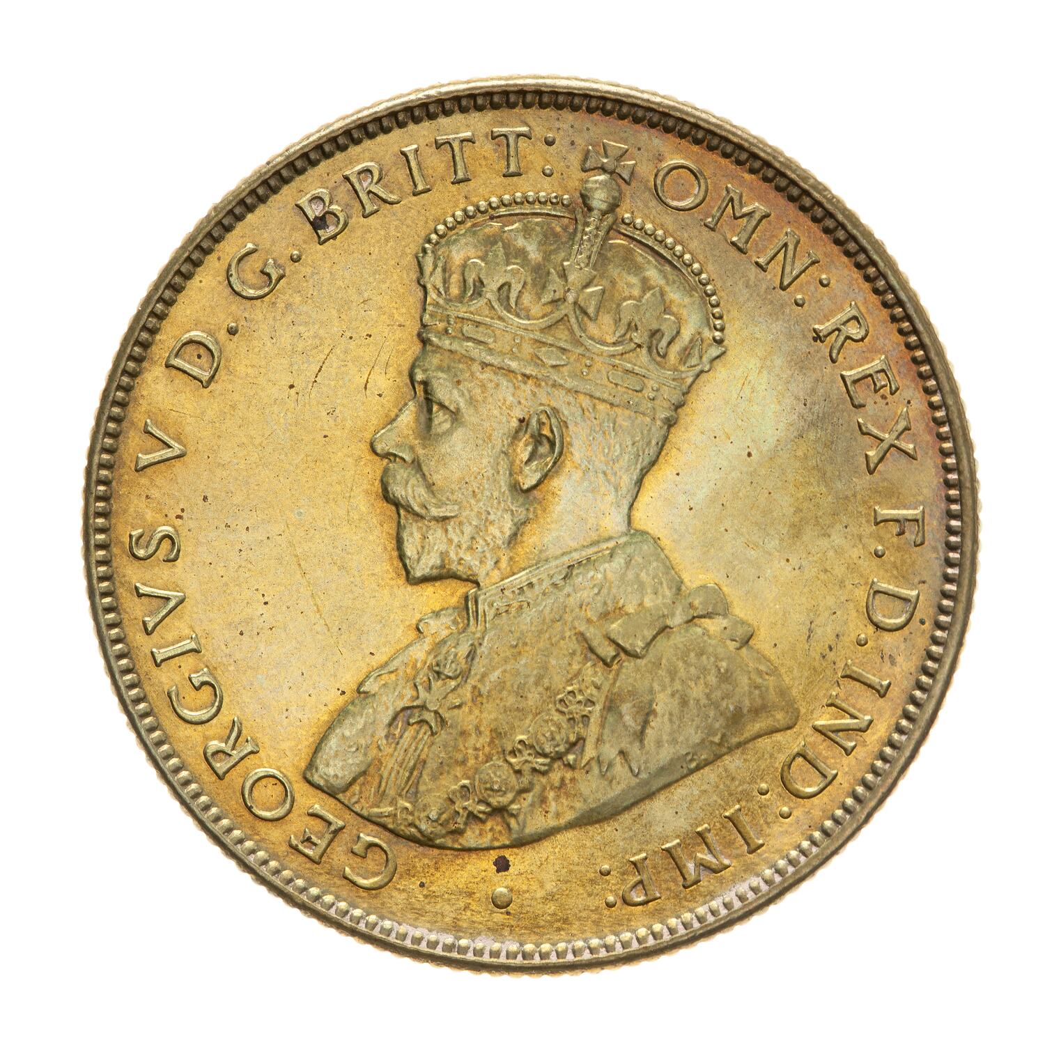 Crowned and draped bust of the King facing left, the King is wearing the Imperial Crown and the ermine Robe of State, the Collar of the Most Noble Order of the Garter, and the Badge of the Most Honourable Order of the Bath; around, GEORGIVS V D.G. BRITT: OMN: REX F.D. IND: IMP:; artist's initials BM on bust truncation