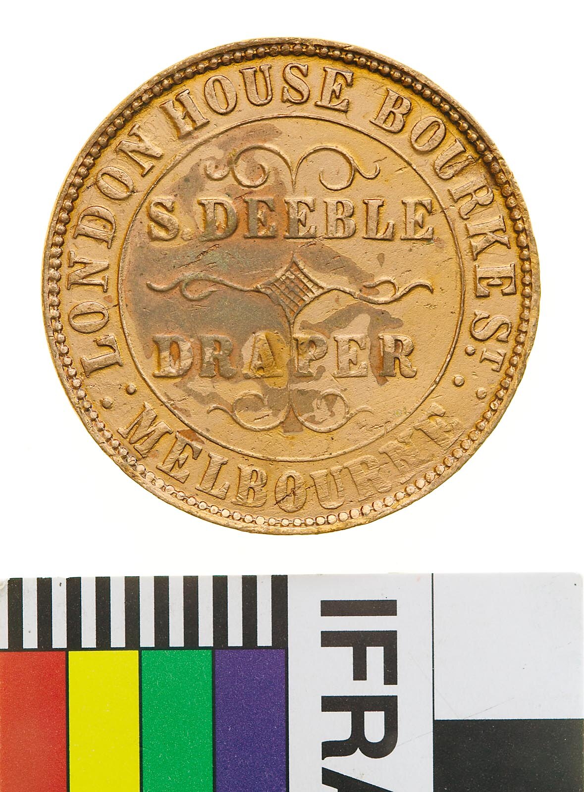 Obverse:S.DEEBLE DRAPER LONDON HOUSE BOURKE ST MELBOURNE Reverse: VICTORIA 1862 ADVANCE VICTORIA T. STOKES MAKER 100 COLLINS ST. EAST MELBOURNE.