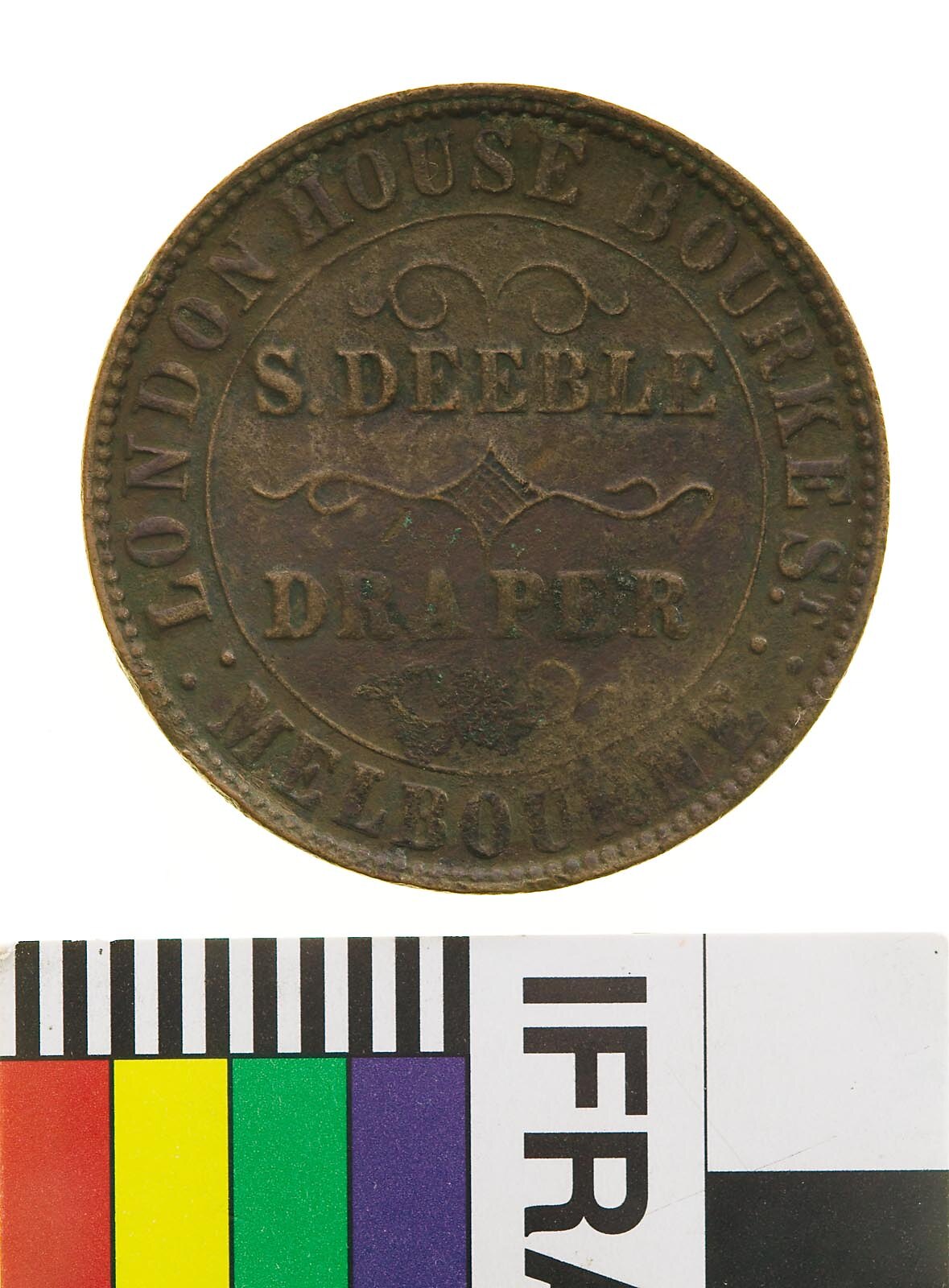 Copper One Penny Token, minted by Thomas Stokes, Melbourne. Issued by S. Deeble, Draper, Melbourne, 1862. Samuel Deeble arrived in Melbourne in 1853. He opened a shop in Melbourne shortly after his arrival, in 1858 Deeble advertised in the Sands and McDougall Melbourne Directory, describing himself as a wholesale and retail draper, specalising in millinery including 'Bonnets, Hats, Bonnet Shapes, Blonds, Ribbons, Feathers &c., at wholesale prices.'