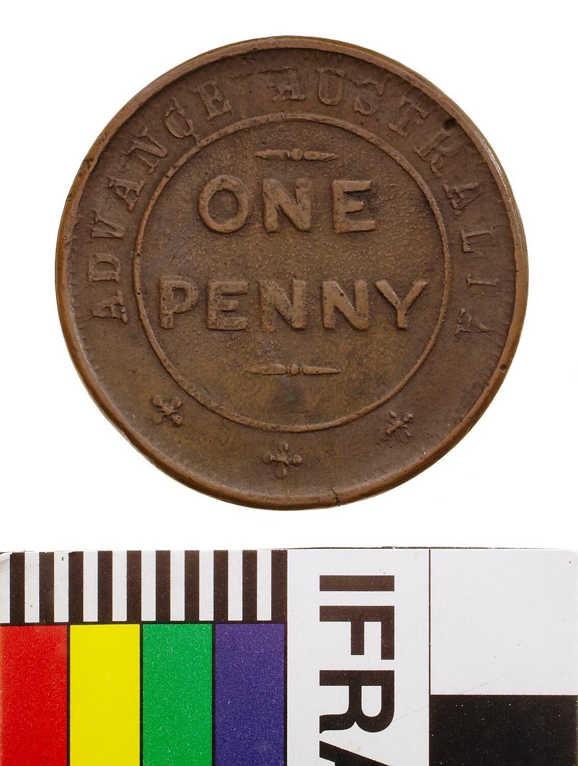 A round copper token (34 mm diameter). The token does not include the name the issuer and manufacturer: Whitty & Brown, Sydney, but the shared reverse die and characteristic poor workmanship make it clear that this company was responsible. It features the denomination and the motto Advance Australia on the obverse and a representation of Justice standing blindfolded holding scales and an inverted cornucopiae spilling fruit on the ground. The drapery from her right shoulder ends below the horizon line. A sailing ship is on the horizon. The die work is of poor quality and the token weakly struck. This token shows effects of double striking around the lettering of ONE on the obverse.