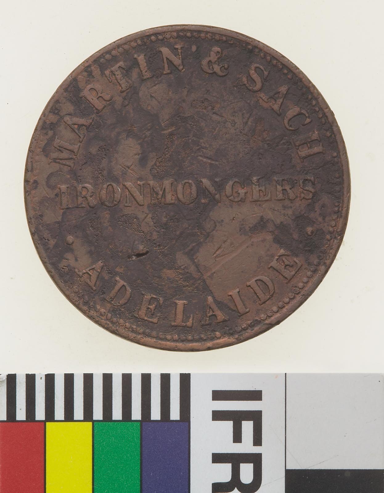 Copper One Penny Token, minted by Heaton & Sons, Birmingham. Issued by Martin & Sach, Ironmongers, Adelaide, South Australia, circa 1858. The earliest reference to Martin & Sach was found in the 1854 Royal South Australian Almanac, when they were listed as Ironmongers of Hindley Street. The earliest advertisement located for Martin and Sach was not for their role as Ironmongers, but an 1862 entry for their role as the 'Wholesale agents for South Australia' for Lea and Perrins' Worcestershire Sauce (The South Australian Advertiser, 6 January 1862, p. 1). In 1867 they took out a half page advertisement in the National Directory of South Australia for 1867 - 1868, listing a huge range of commercial and domestic ironmongery, as well as the sauce mentioned above. In 1870 Martin and Sach do not appear in the Adelaide Almanac, Town and Country Directory and Guide to South Australia, but in the following year's edition 'F & S Sach, Ironmongers' took out a full page advertisement for their business at 58 Rundle Street. It seems likely that Sach established his own business after the end of his partnership with Martin.