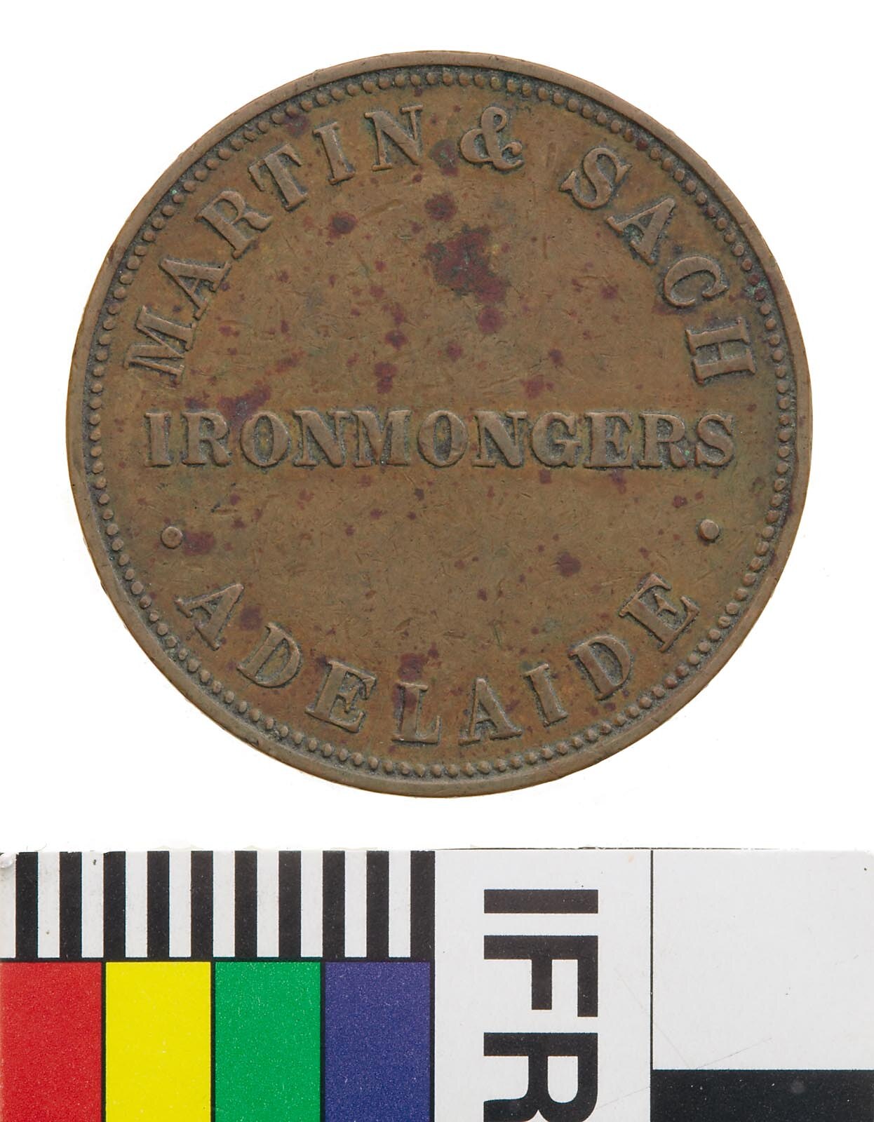 Copper One Penny Token, minted by Heaton & Sons, Birmingham. Issued by Martin & Sach, Ironmongers, Adelaide, South Australia, circa 1858. The earliest reference to Martin & Sach was found in the 1854 Royal South Australian Almanac, when they were listed as Ironmongers of Hindley Street. The earliest advertisement located for Martin and Sach was not for their role as Ironmongers, but an 1862 entry for their role as the 'Wholesale agents for South Australia' for Lea and Perrins' Worcestershire Sauce (The South Australian Advertiser, 6 January 1862, p. 1). In 1867 they took out a half page advertisement in the National Directory of South Australia for 1867 - 1868, listing a huge range of commercial and domestic ironmongery, as well as the sauce mentioned above. In 1870 Martin and Sach do not appear in the Adelaide Almanac, Town and Country Directory and Guide to South Australia, but in the following year's edition 'F & S Sach, Ironmongers' took out a full page advertisement for their business at 58 Rundle Street. It seems likely that Sach established his own business after the end of his partnership with Martin.