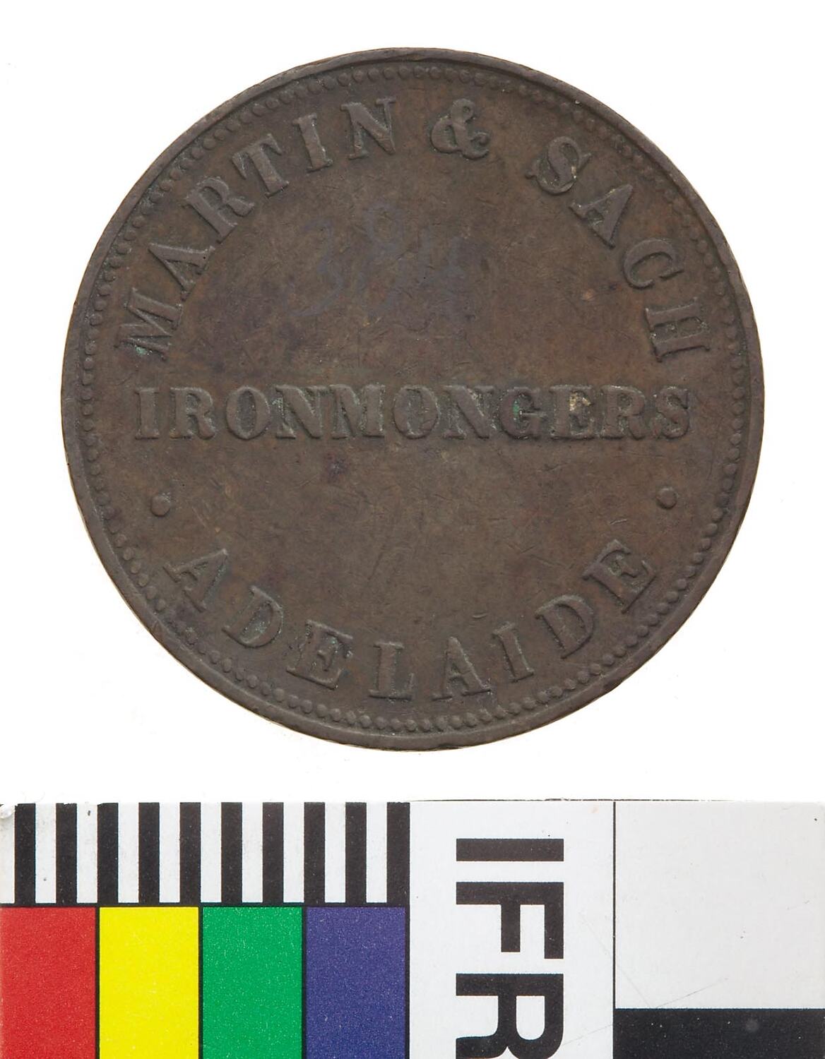 Copper One Penny Token, minted by Heaton & Sons, Birmingham. Issued by Martin & Sach, Ironmongers, Adelaide, South Australia, circa 1858. The earliest reference to Martin & Sach was found in the 1854 Royal South Australian Almanac, when they were listed as Ironmongers of Hindley Street. The earliest advertisement located for Martin and Sach was not for their role as Ironmongers, but an 1862 entry for their role as the 'Wholesale agents for South Australia' for Lea and Perrins' Worcestershire Sauce (The South Australian Advertiser, 6 January 1862, p. 1). In 1867 they took out a half page advertisement in the National Directory of South Australia for 1867 - 1868, listing a huge range of commercial and domestic ironmongery, as well as the sauce mentioned above. In 1870 Martin and Sach do not appear in the Adelaide Almanac, Town and Country Directory and Guide to South Australia, but in the following year's edition 'F & S Sach, Ironmongers' took out a full page advertisement for their business at 58 Rundle Street. It seems likely that Sach established his own business after the end of his partnership with Martin.