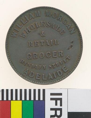 Obverse: WILLIAM MORGAN WHOLESALE & RETAIL GROCER HINDLEY STREET ADELAIDE Reverse: AUSTRALIA 1858