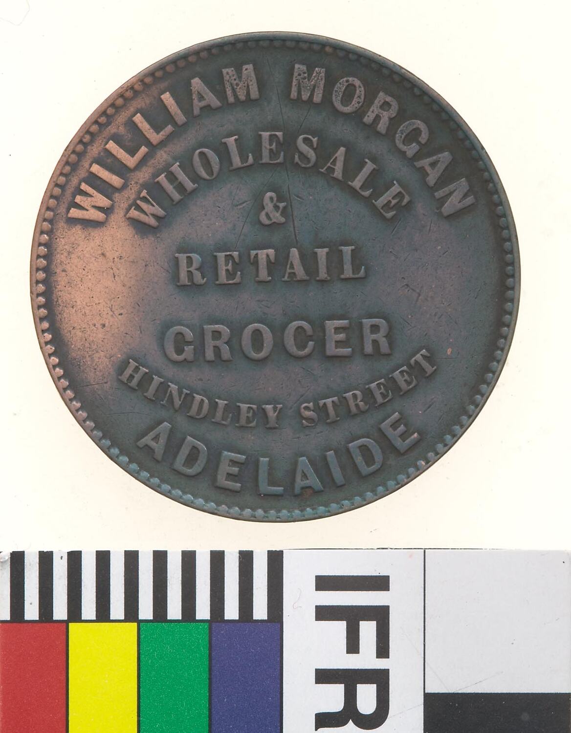 Obverse: WILLIAM MORGAN WHOLESALE & RETAIL GROCER HINDLEY STREET ADELAIDE Reverse: AUSTRALIA 1858