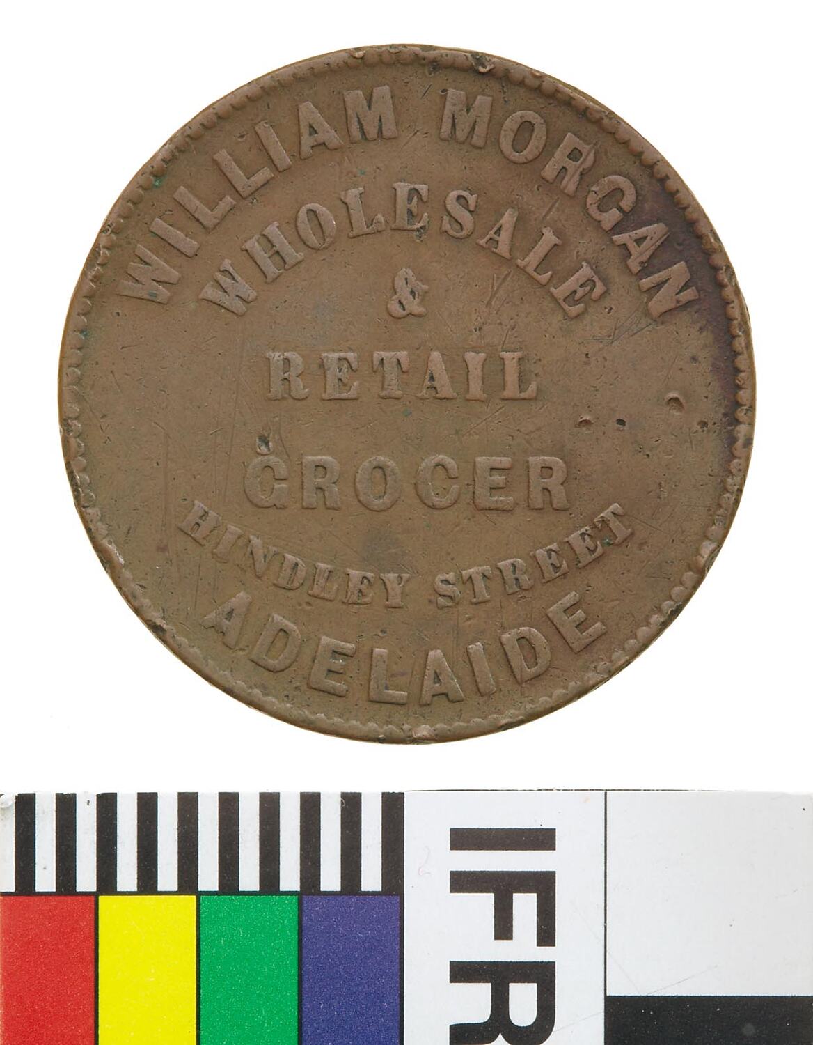 Obverse: WILLIAM MORGAN WHOLESALE & RETAIL GROCER HINDLEY STREET ADELAIDE Reverse: AUSTRALIA 1858