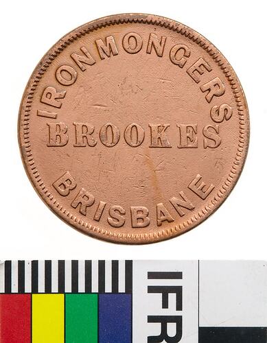 A round copper token (35 mm diameter). The token features the name address and business of the issuer: Brookes, Brisbane, Ironmonger on both sides. This token has been cleaned and varnished.
