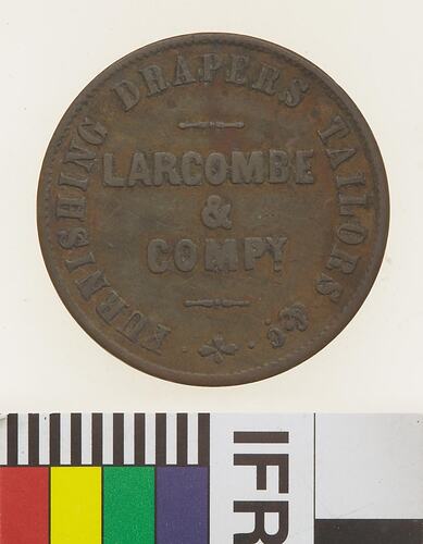 A round copper token (33 mm diameter). The token features the name address and business of the issuer: Larcombe & Compy., Brisbane, Furnishing, Drapers, Tailors etc.