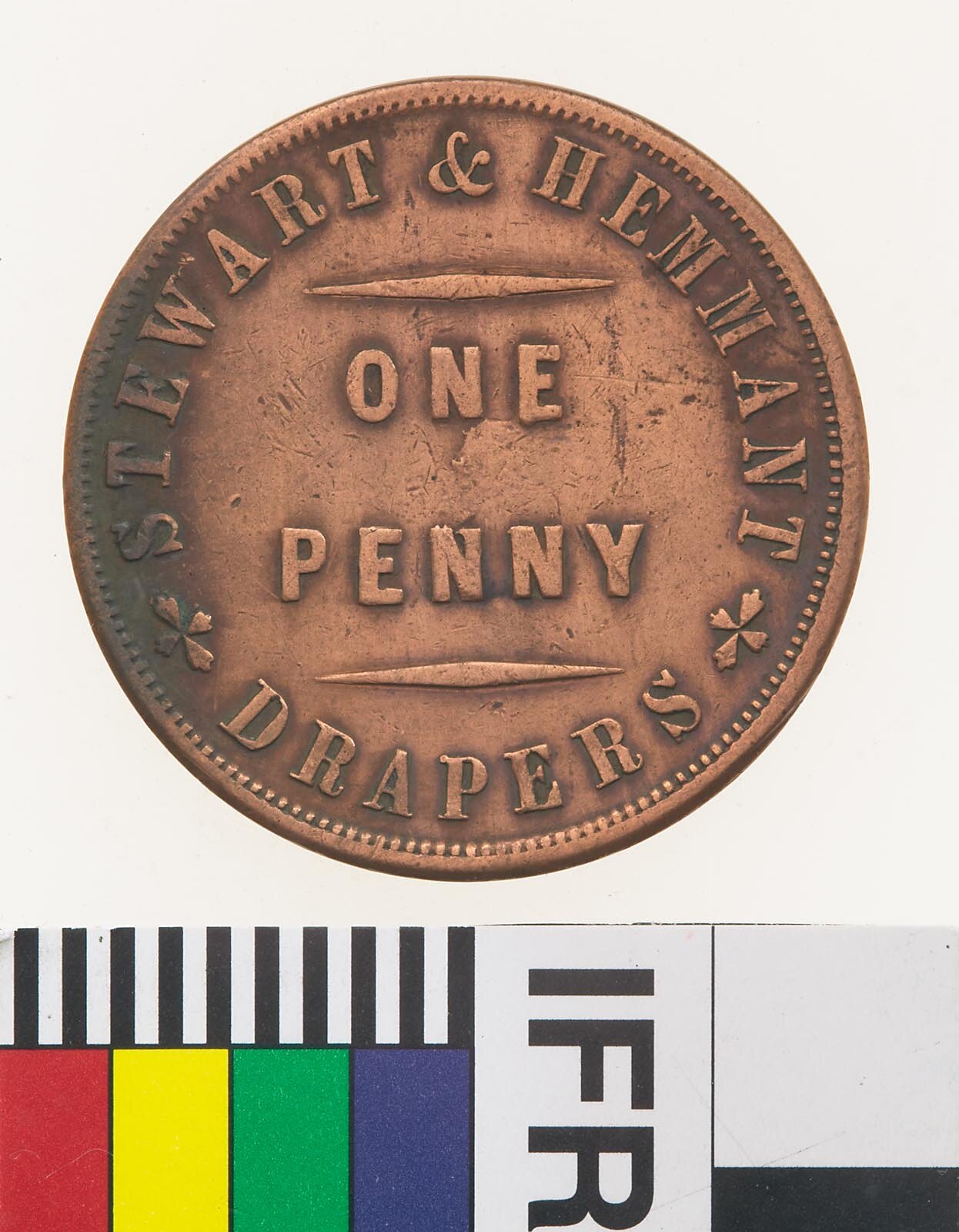 Copper One Penny Token, minted by W.J.Taylor, London. Issued by Stewart & Hemmant, Drapers, Brisbane & Rockhampton, circa 1863. William Hemmant and Alexander Stewart established their drapery business in Queen Street, Brisbane, in 1860. The store was burned to the ground in 1864, one of many businesses destroyed by a disastrous fire, although it was subsequently rebuilt. In Hemmant 1876 he moved to London to act as agent for the Brisbane drapery business. In 1862, Stewart and Hemmant opened a business in Rockhampton which was run by James Stewart, Alexander's twin brother. In 1868 James Stewart bought out Hemmant's interest in the business in 1868, and took Edward Seymour Lucas, his chief assistant since 1863, into partnership.