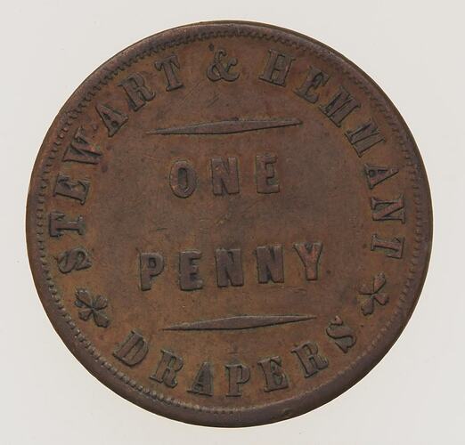 Copper One Penny Token, minted by W.J.Taylor, London. Issued by Stewart & Hemmant, Drapers, Brisbane & Rockhampton, circa 1863. William Hemmant and Alexander Stewart established their drapery business in Queen Street, Brisbane, in 1860. The store was burned to the ground in 1864, one of many businesses destroyed by a disastrous fire, although it was subsequently rebuilt. In Hemmant 1876 he moved to London to act as agent for the Brisbane drapery business. In 1862, Stewart and Hemmant opened a business in Rockhampton which was run by James Stewart, Alexander's twin brother. In 1868 James Stewart bought out Hemmant's interest in the business in 1868, and took Edward Seymour Lucas, his chief assistant since 1863, into partnership.