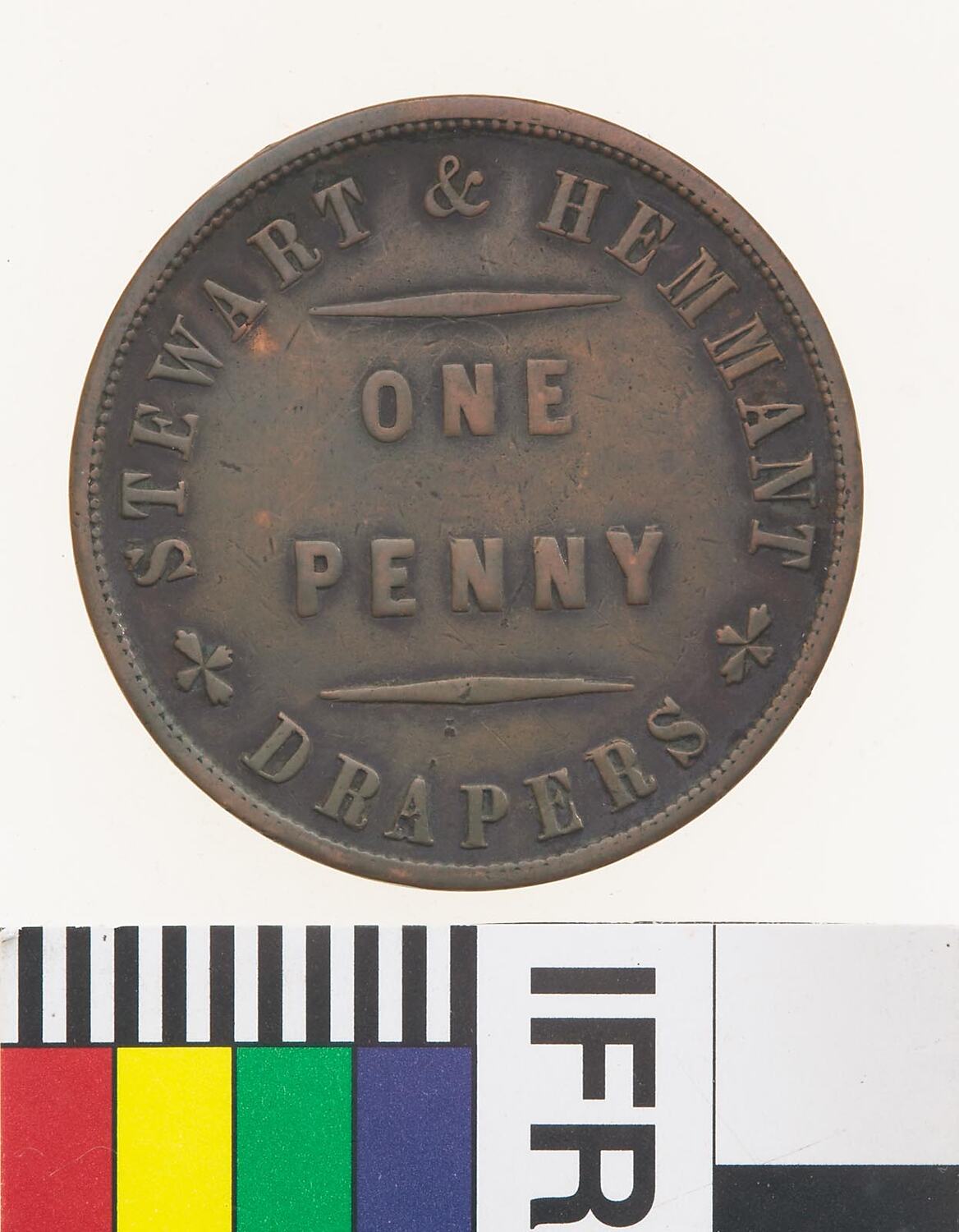 Copper One Penny Token, minted by W.J.Taylor, London. Issued by Stewart & Hemmant, Drapers, Brisbane & Rockhampton, circa 1863. William Hemmant and Alexander Stewart established their drapery business in Queen Street, Brisbane, in 1860. The store was burned to the ground in 1864, one of many businesses destroyed by a disastrous fire, although it was subsequently rebuilt. In Hemmant 1876 he moved to London to act as agent for the Brisbane drapery business. In 1862, Stewart and Hemmant opened a business in Rockhampton which was run by James Stewart, Alexander's twin brother. In 1868 James Stewart bought out Hemmant's interest in the business in 1868, and took Edward Seymour Lucas, his chief assistant since 1863, into partnership.