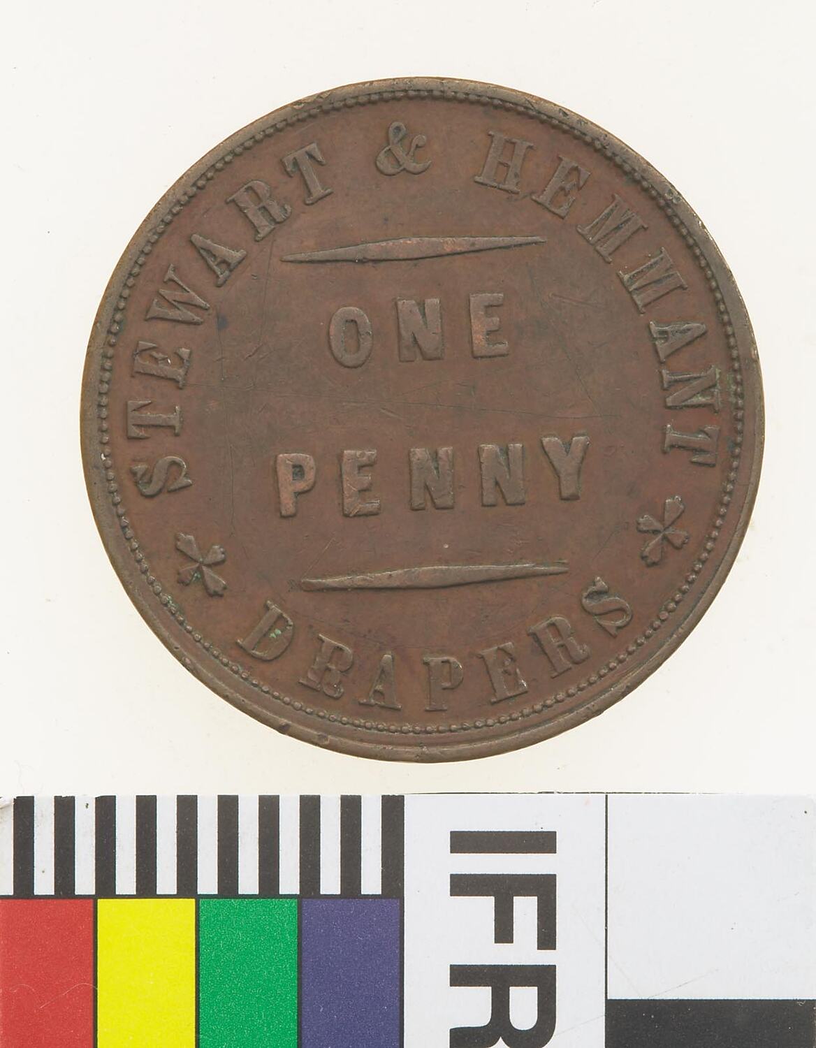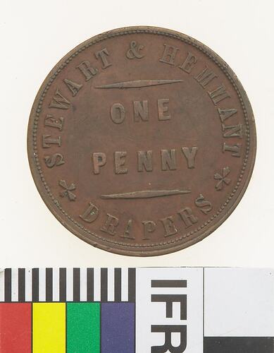 Copper One Penny Token, minted by W.J.Taylor, London. Issued by Stewart & Hemmant, Drapers, Brisbane & Rockhampton, circa 1863. William Hemmant and Alexander Stewart established their drapery business in Queen Street, Brisbane, in 1860. The store was burned to the ground in 1864, one of many businesses destroyed by a disastrous fire, although it was subsequently rebuilt. In Hemmant 1876 he moved to London to act as agent for the Brisbane drapery business. In 1862, Stewart and Hemmant opened a business in Rockhampton which was run by James Stewart, Alexander's twin brother. In 1868 James Stewart bought out Hemmant's interest in the business in 1868, and took Edward Seymour Lucas, his chief assistant since 1863, into partnership.