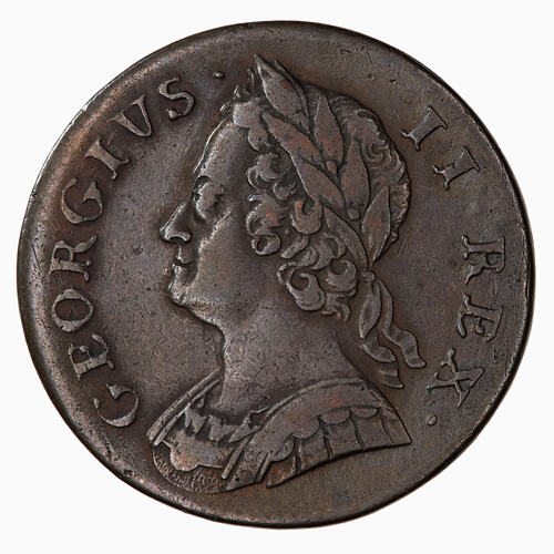 Old laureate bust of George II facing left wearing armour; around, GEORGIVS II REX