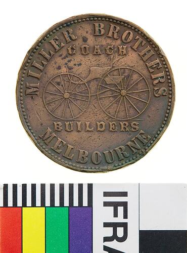 Copper One Penny Token, minted by Thomas Stokes, Melbourne. Issued by Miller Brothers, Coach Builders, Melbourne, 1862. William Miller, a 24 year-old native of Belfast in Northern Ireland, arrived in Australia in November 1857. On board with him was one Nancy Miller, aged 22. William was a coachbuilder, and continued in that trade in Melbourne. After a year or so his brothers, John, Hercules, William and George, joined him in Melbourne. In 1865 only three of the brothers were listed, John had apparently departed. In 1868 Hercules' was the only name associated with the business, In 1869 William returned to the business and was the sole person associated with the listing in 1870. William Miller left Melbourne, and started another coach building business, this time in Bendigo. He ran his business there for twenty years before returning to Melbourne and establishing business in South Melbourne.