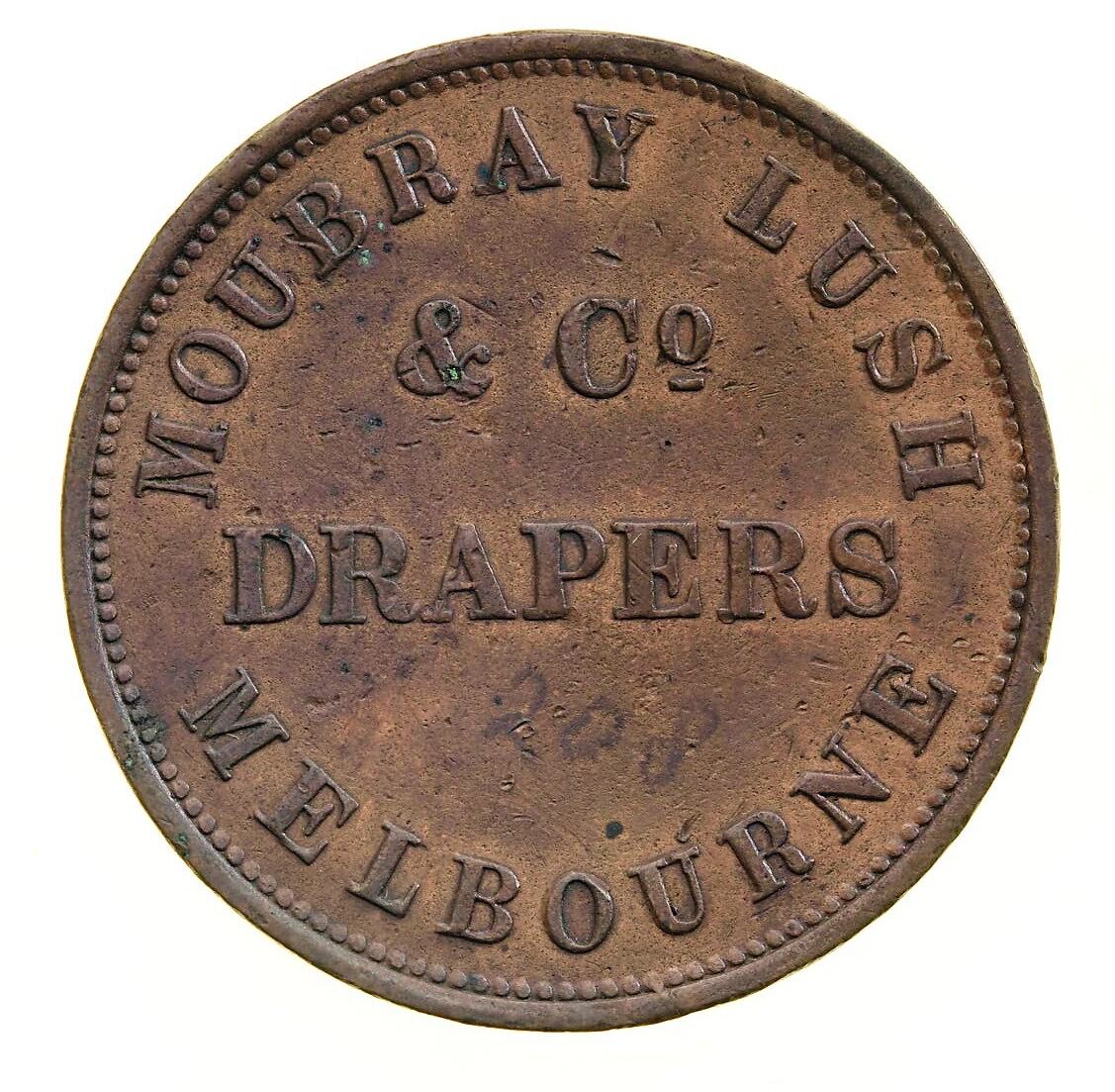 Obverse: MOUBRAY LUSH & Co. DRAPERS MELBOURNE Reverse: AUSTRALIA