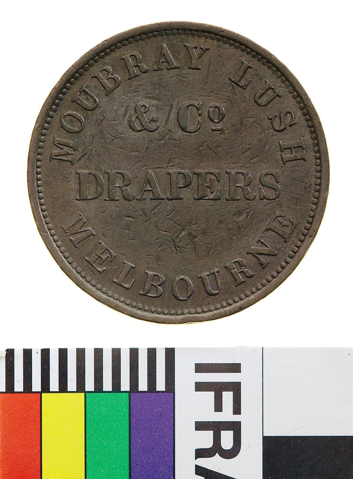 Copper One Penny Token, minted by Heaton & Sons, Birmingham. Issued by Moubray, Lush & Co, Drapers, Melbourne, circa 1855. The firm was founded in 1853 by Thomas Moubray and Joseph Lush. According to Gardner, in 1866 three new partners were admitted to the firm: Christopher Rowan, J.W. Shanklin and Robert Hicks. Lush died in 1870, in 1876 Shanklin retired, in 1878 G.W. Atkinson joined the firm, and its name became Moubray, Rowan and Hicks. Atkinson soon moved to England to manage the London branch of the business, but his health declined and he retired. About that time the business moved to 350 Collins Street, where it still stood in 1910. Moubray died on 25 September 1891. At his death Moubray's share was purchased by Hicks and Atkinson, along with that of Rowan, and they then brought in their sons and relations as partners. In 1910 the firm was trading under the name Hicks, Atkinson and Sons.