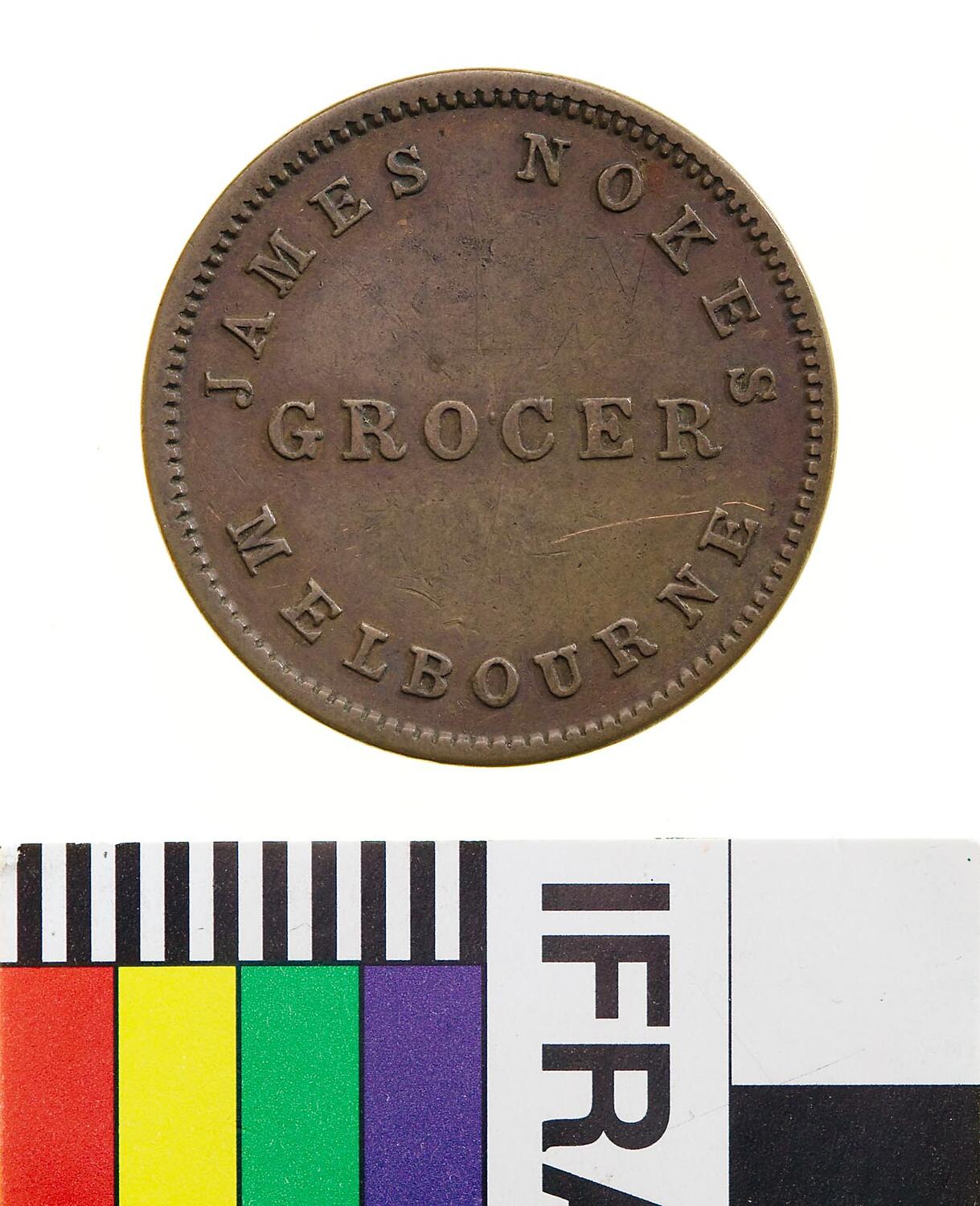 A round copper token (28 mm diameter) giving the name address and business of the issuer: James Nokes, Melbourne, grocer and on the reverse commemorating the arrival of Sir Charles Hotham on 22 June 1854.