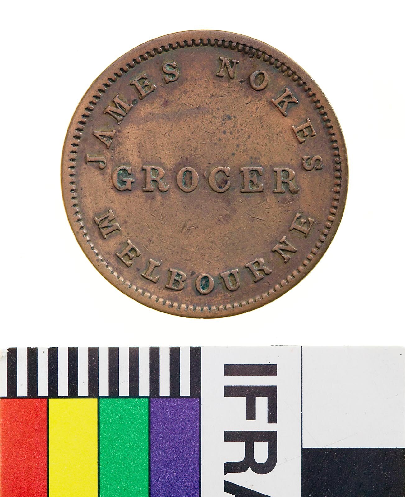 A round copper token (28 mm diameter) giving the name address and business of the issuer: James Nokes, Melbourne, grocer and on the reverse commemorating the arrival of Sir Charles Hotham on 22 June 1854. This token has been cleaned and the reverse has re-toned dark green