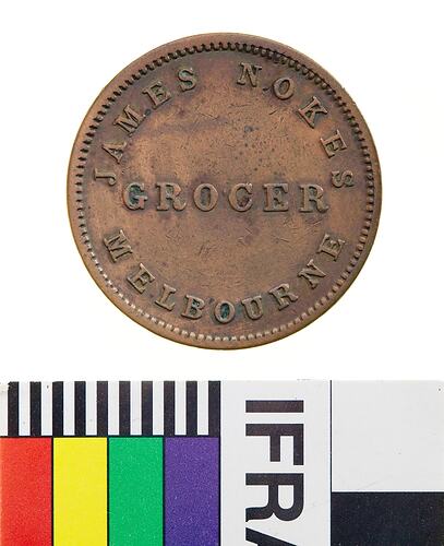 Obverse: JAMES NOKES GROCER MELBOURNE Reverse: IN COMMEMORATION OF THE LANDING OF SIR CHARLES HOTHAM 22D JUNE 1854