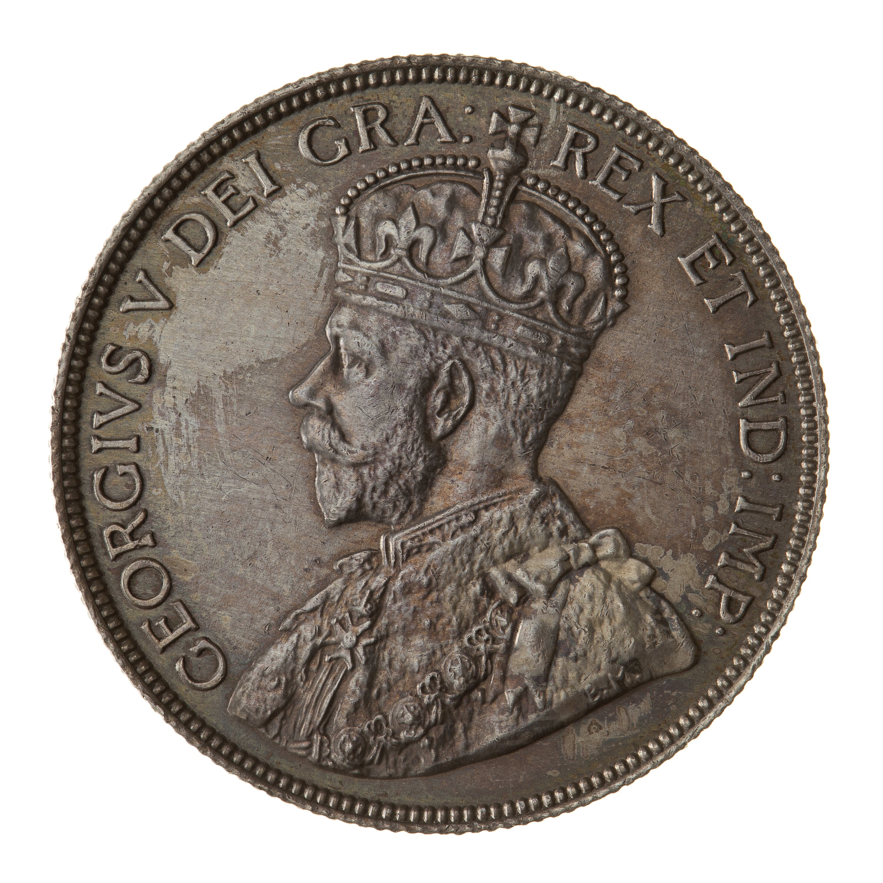 Crowned and draped bust of the King facing left; around, GEORGIVS V DEI GRA: REX ET IND: IMP:; artist's initials, B.M., on bust truncation