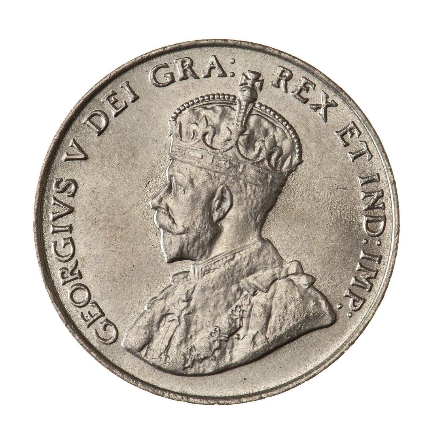 Crowned and draped bust of the King facing left; around, GEORGIVS V DEI GRA: REX ET IND: IMP:; artist's initials, B.M., on bust truncation