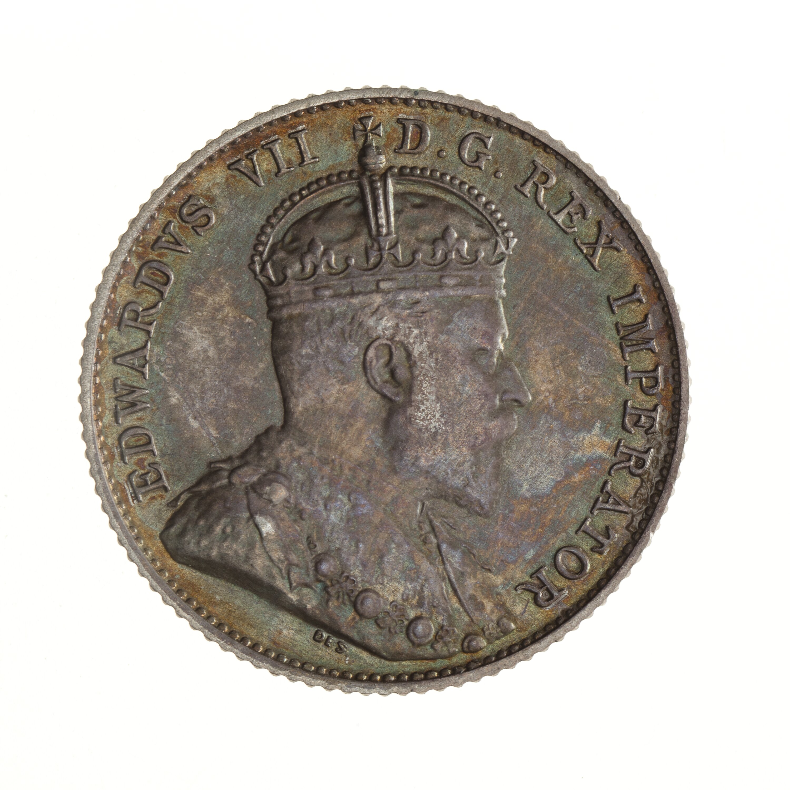 Crowned and draped bust of the King facing right; around, EDWARDVS VII D. G. REX IMPERATOR; the artist's initials, DES, in field below bust