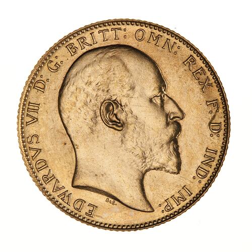 Bare head of the King facing right; around, EDWARDVS VII D:G: BRITT: OMN: REX F:D: IND: IMP: