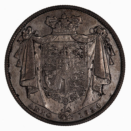 Crowned shield bearing the Royal Arms on mantle, at base, the Collar of the Garter; around below, ANNO 1834