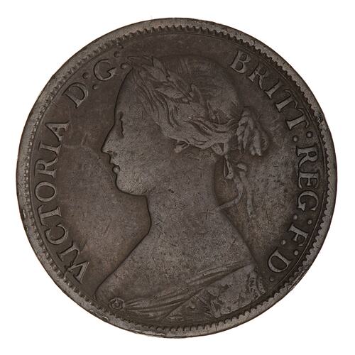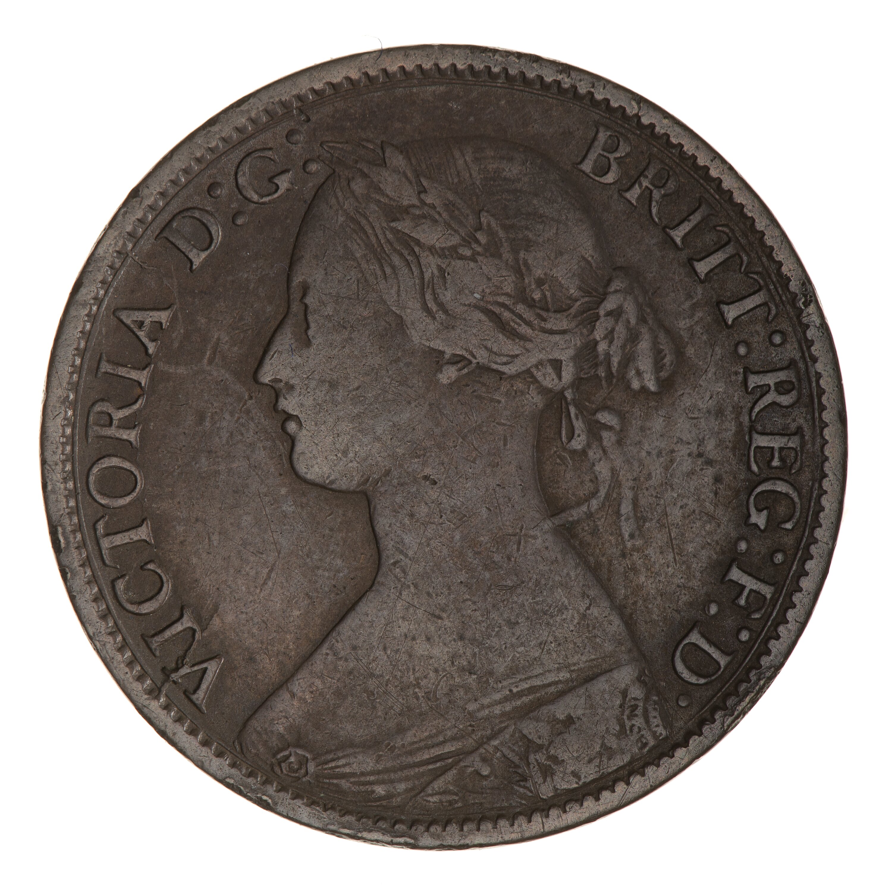 Laureate bust of the Queen facing left; around, VICTORIA D:G: BRIT: REG: F:D: