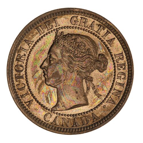 Within a beaded circle, head of the Queen facing left wearing coronet; around, VICTORIA DEI GRATIA REGINA; below, CANADA