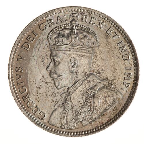 Crowned bust of the King facing left; around, GEORGIVS V DEI GRA: REX ET IND: IMP:; on bust truncation in small letters the artist's initials, B.M.