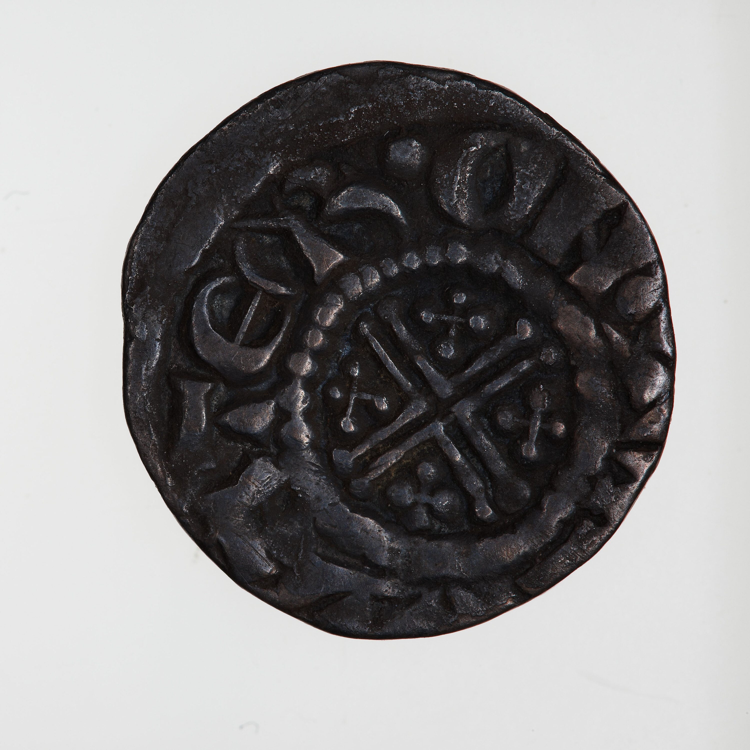 A short cross voided within a beaded circle, a quatrefoil in each angle; around, ..TER ON LVND