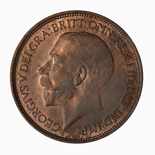 Bare head of the King facing left; below on neck truncation in small letters, B.M. (Bertram MacKennal); around, GEORGIVS V DEI GRA: BRITT: OMN: REX FID: DEF: IND: IMP: