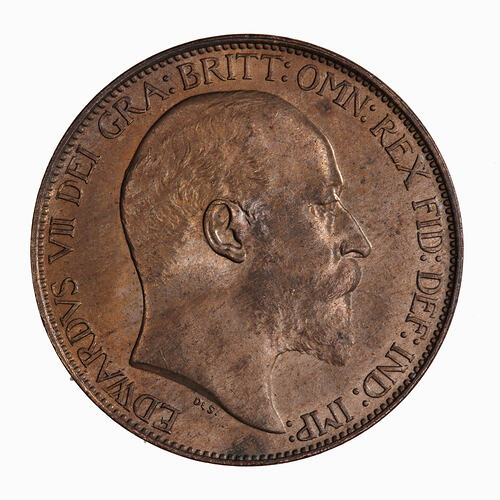 Bare head of the King facing right; below in small letters De S. (for G.W. De Saulles Mint Engraver); around, EDWARDVS VII DEI GRA: BRITT: OMN: REX FID: DEF: IND: IMP: