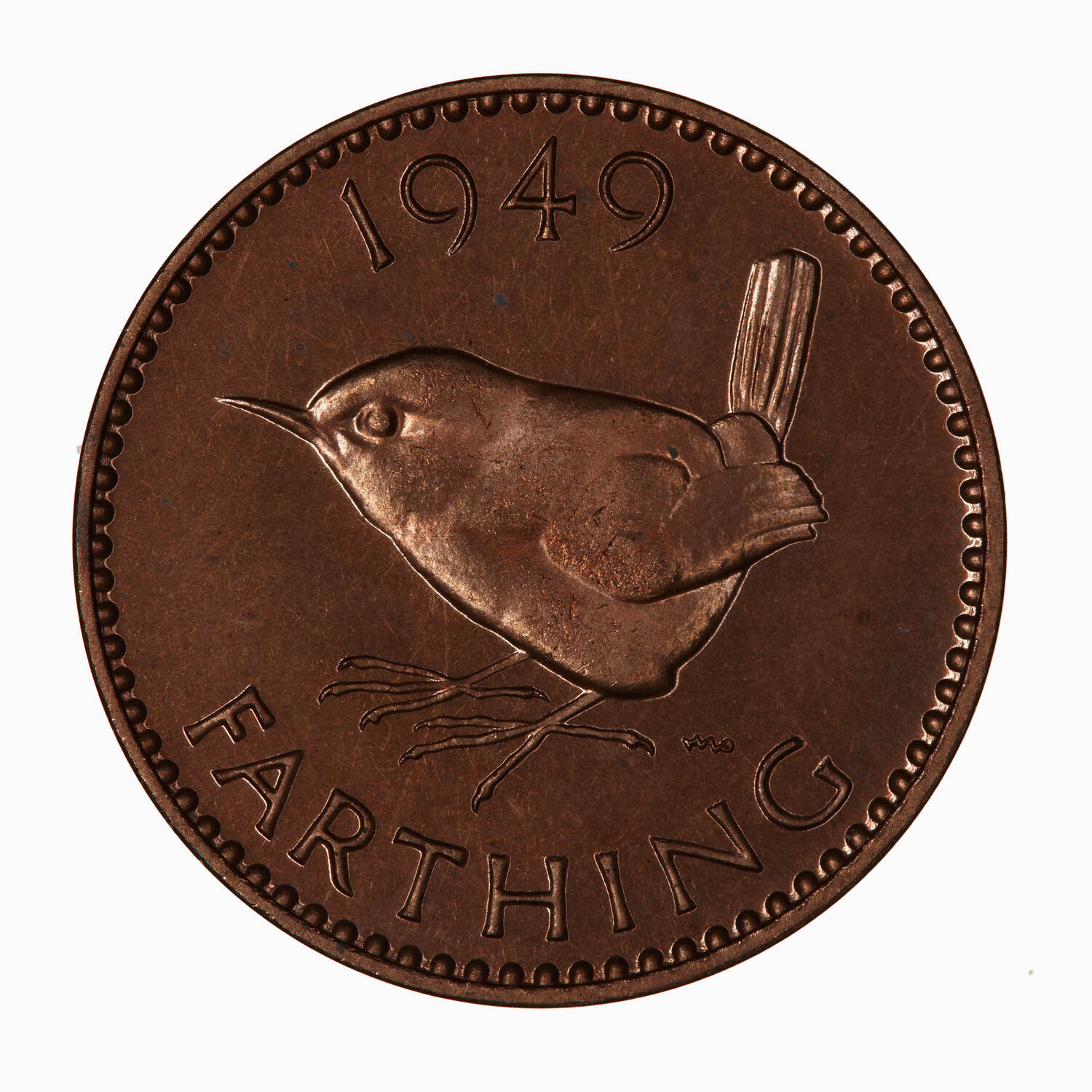 Wren standing facing left; behind in field monogram HWP (H. Wilson Parker); below, FARTHING; above, 1949