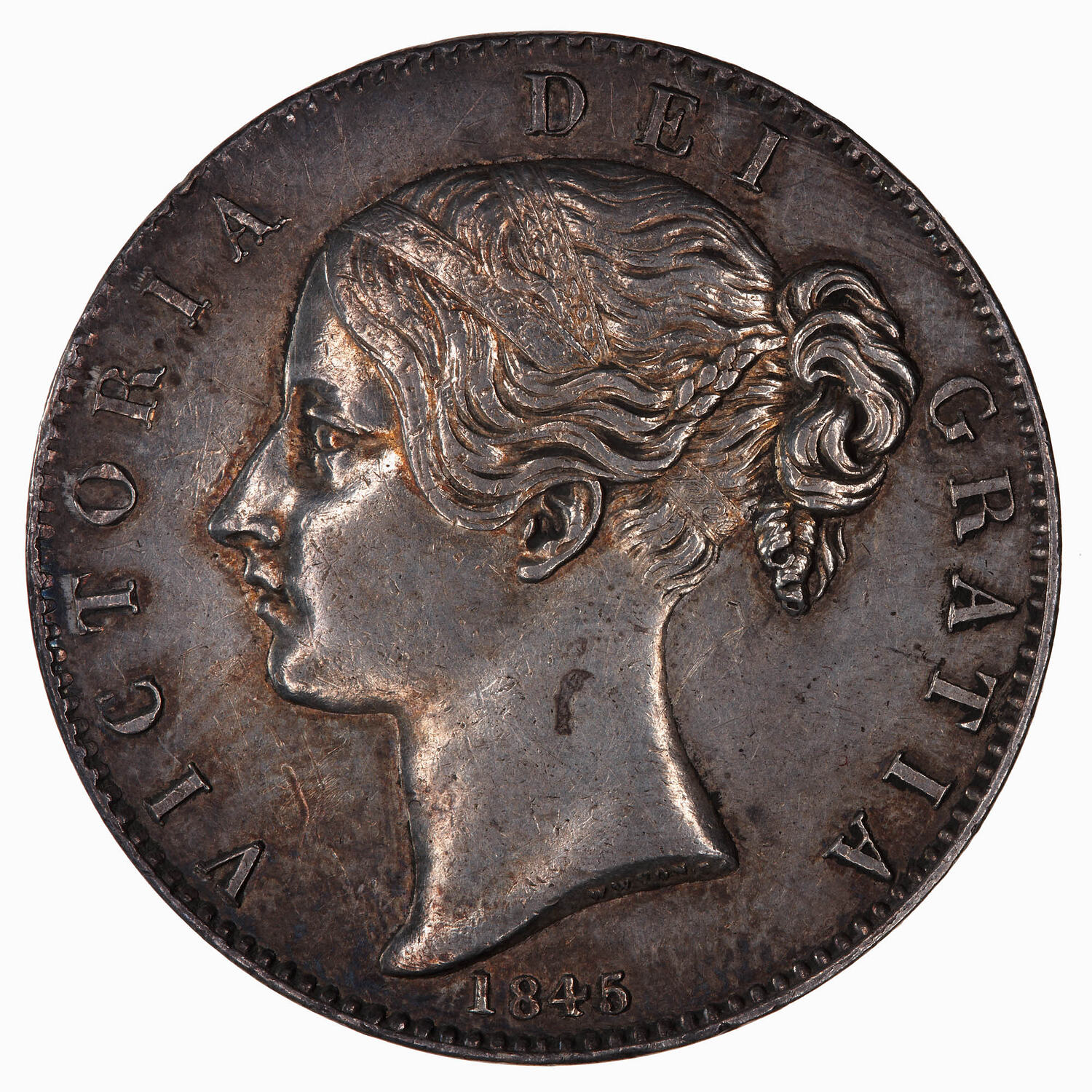 Head of the Queen facing left wearing ribbon in hair; in small letters on neck truncation the artist's name W. WYON R.A.; around, VICTORIA DEI GRATIA; below, 1845