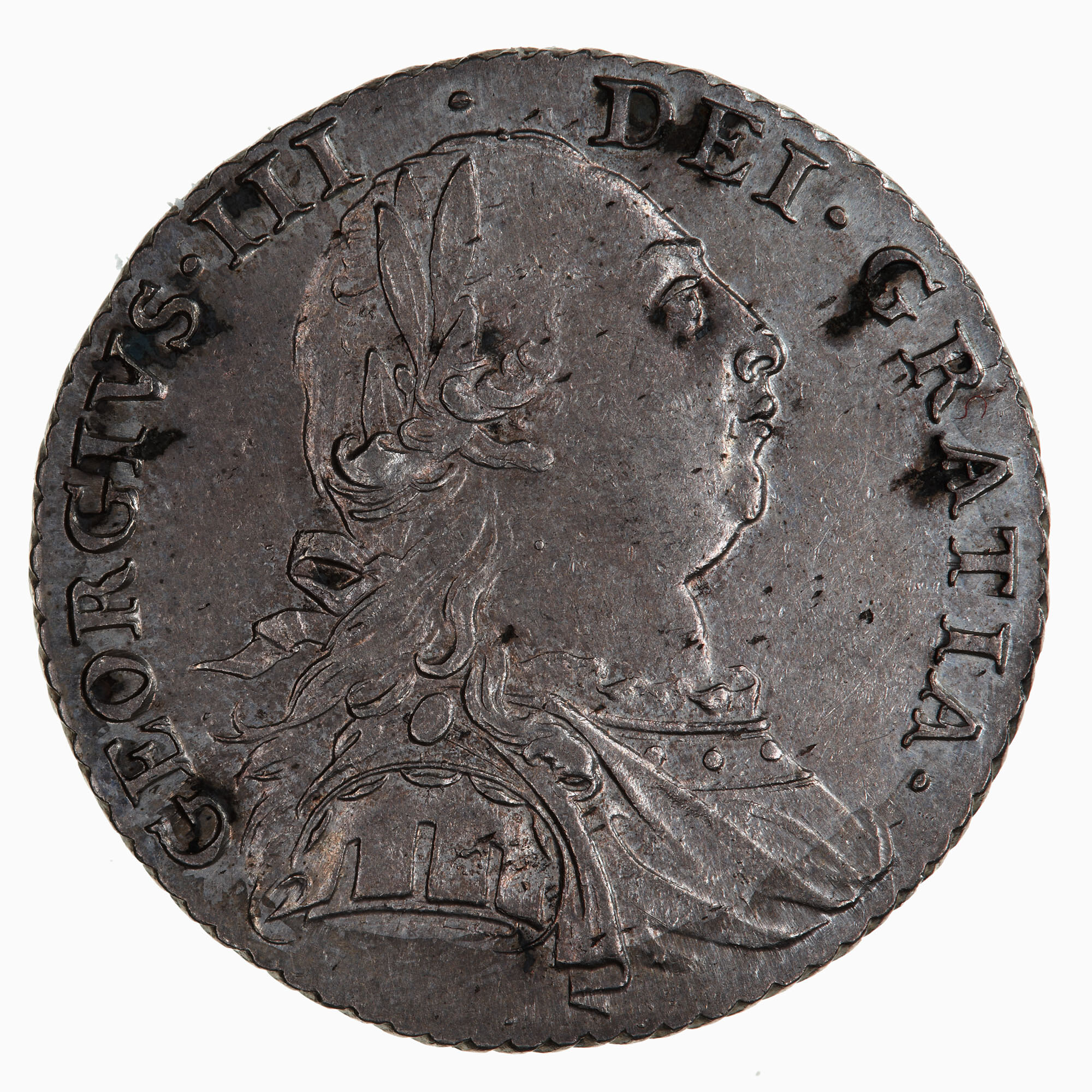 Laureate and draped bust of the King wearing armour facing right; around, GEORGIVS III DEI GRATIA
