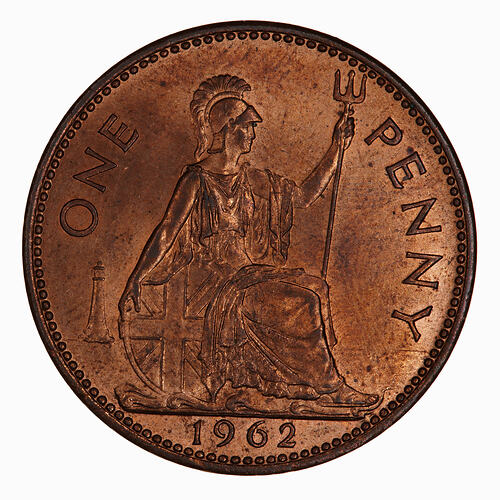 Britannia seated facing right on a rock wearing a helmet and flowing robes; she holds a trident and rests her right hand on a shield which bears the combined crosses of the Union Flag, behind her a lighthouse; around, ONE PENNY; in exergue,1962