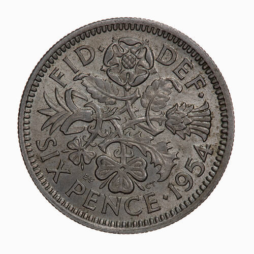 Interlinked rose, thistle, shamrock and leek each with a leaf from the same stem; in small letters at sides of shamrock the artist's initials, EF CT (Edgar Fuller and Cecil Thomas); around above, FID DEF; around below, SIX PENCE 1954