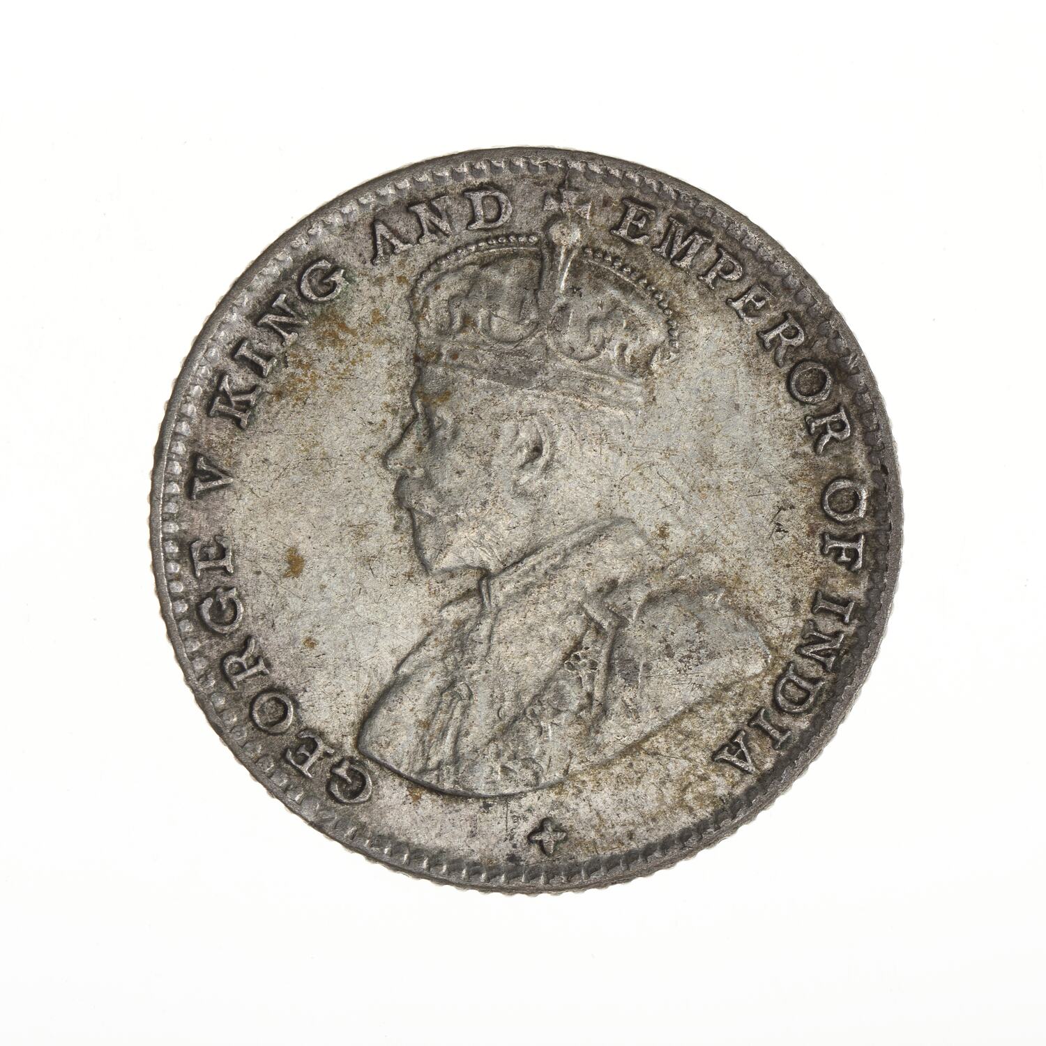 Bust of the King wearing the Imperial crown and an ermine robe with the collar of the Garter; around, GEORGE V KING AND EMPEROR OF INDIA; the artist's initials BM on bust truncation