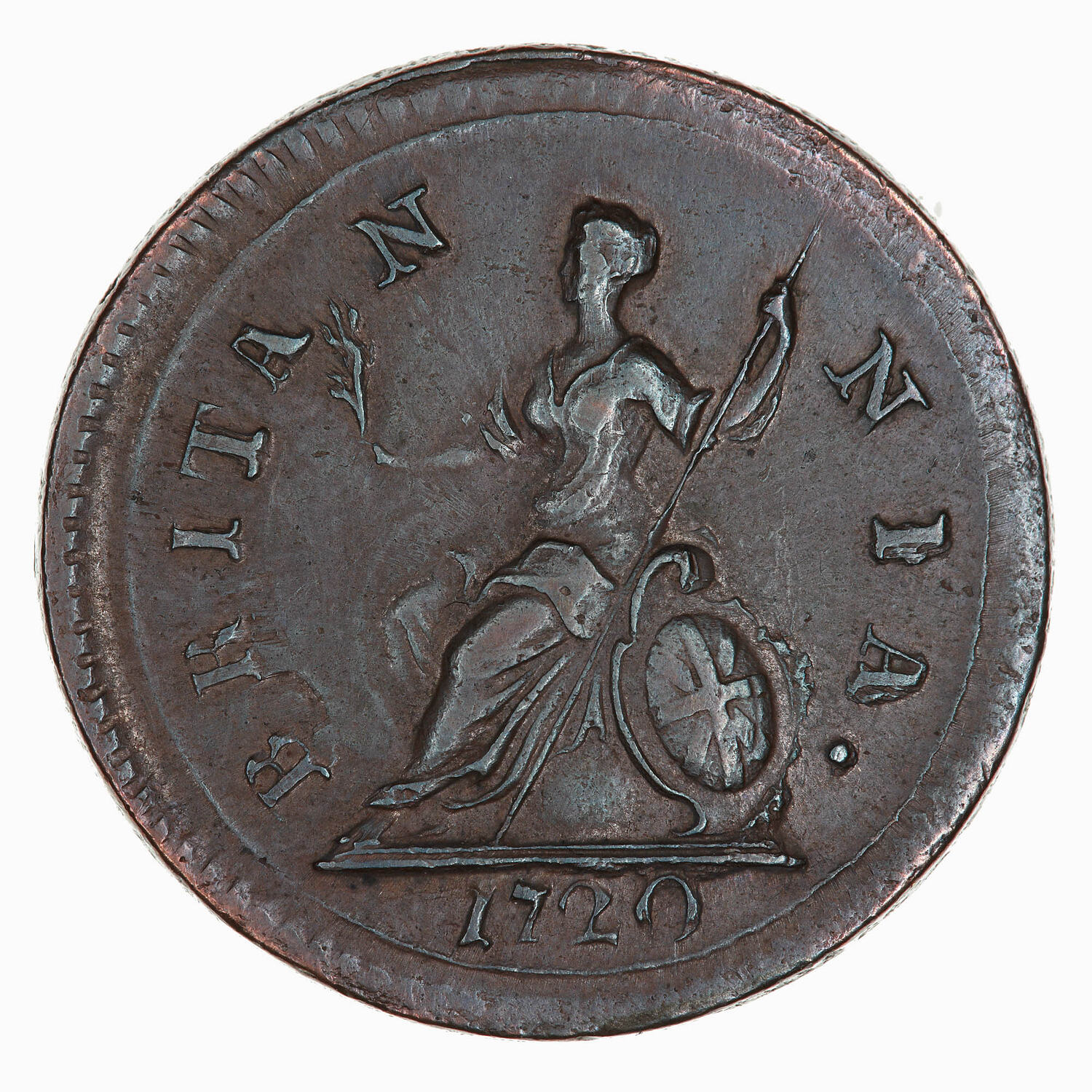 Britannia seated facing left holding an olive branch and a spear; resting at right, a shield with the combined crosses of St. George and St. Andrew; around, BRITANNIA.; in exergue, 1720