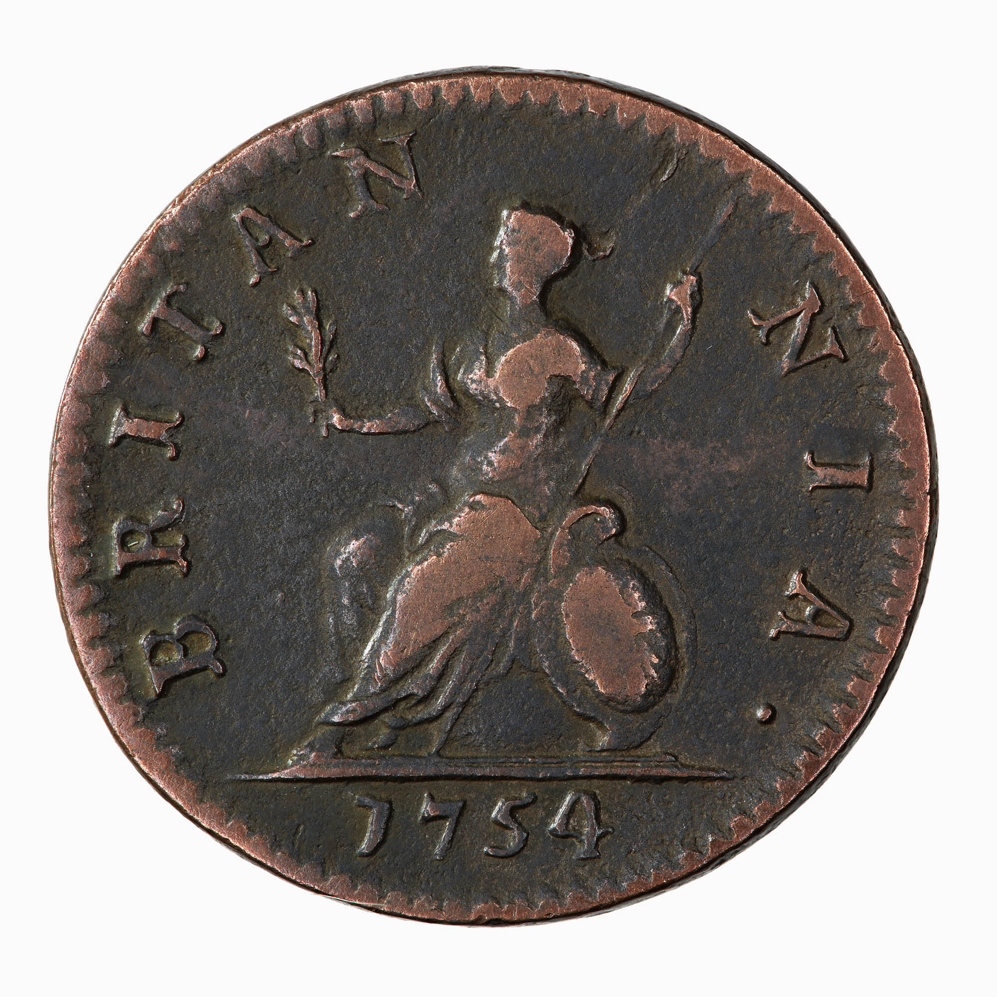 Britannia seated facing left on globe, extending olive branch and holding spear, by her side rests a shield decorated with the combined crosses of St. George and St. Andrew; around, BRITANNIA.; in exergue, 1754