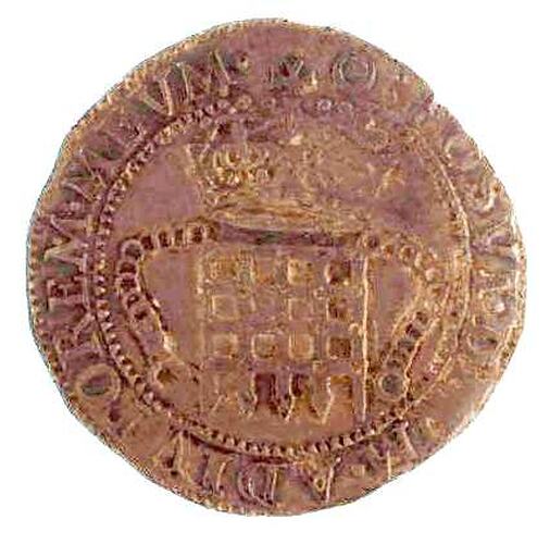 At centre within a partial beaded circle, crowned portcullis with chains; around, 0: POSVI DEVM ADIVTOREM MEVM (translation: I have made God my helper)
