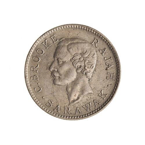 Head of Charles Brooke facing left; around, C. BROOKE RAJAH . SARAWAK .