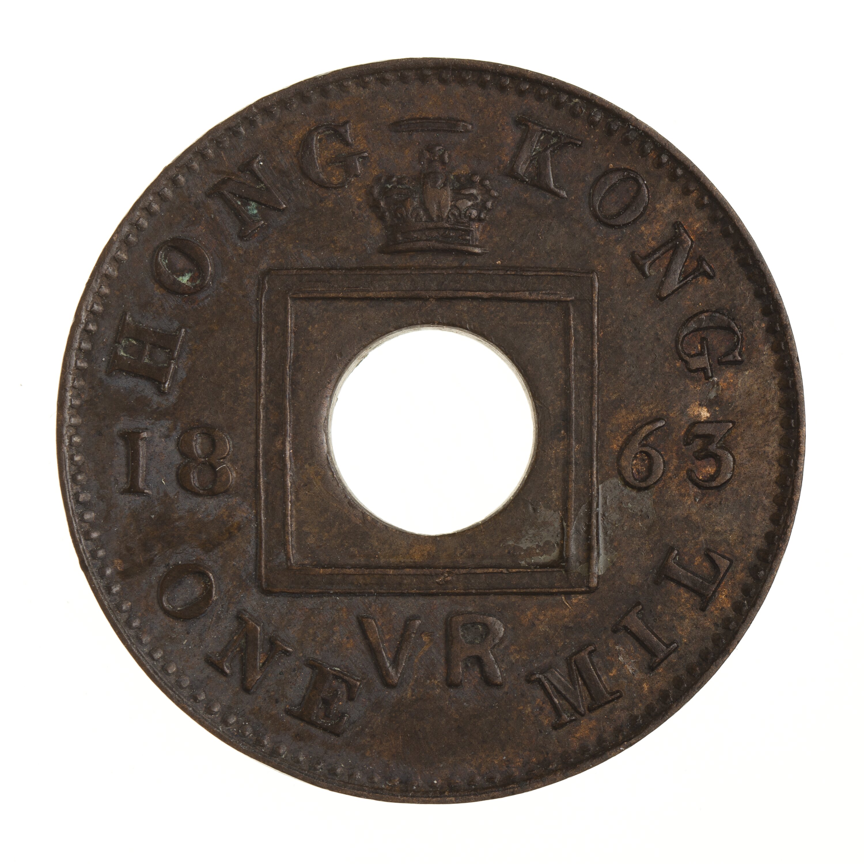 The Mil, or 1/000th dollar, was introduced in 1863, struck at the Royal Mint, London. Three variations are recorded - the first has the Chinese character "Wen" to the left of the hole and HONG-KONG (1863-1865), the second has the "Wen" but HONG KONG (1865) and the third has the Chinese character "Ch'ien" to left of the hole and HONG-KONG (1866)